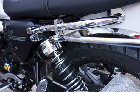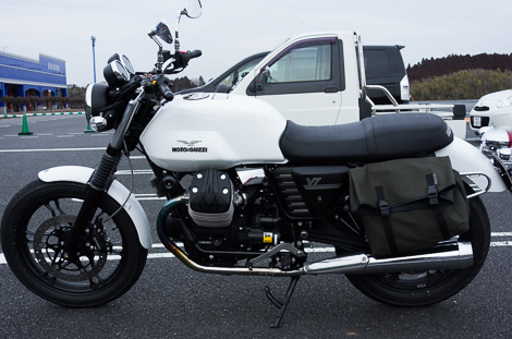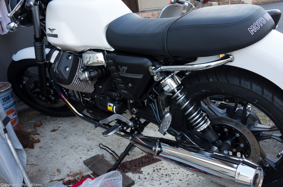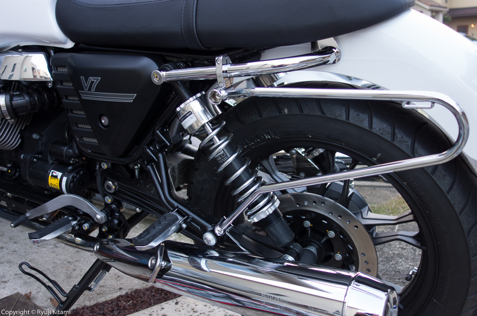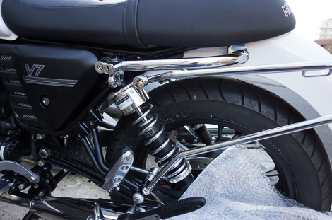 V7 STONEには、シート下にほとんど収納スペースがありません。荷掛けフックの類もないので、ネットを掛けるのもひと苦労。