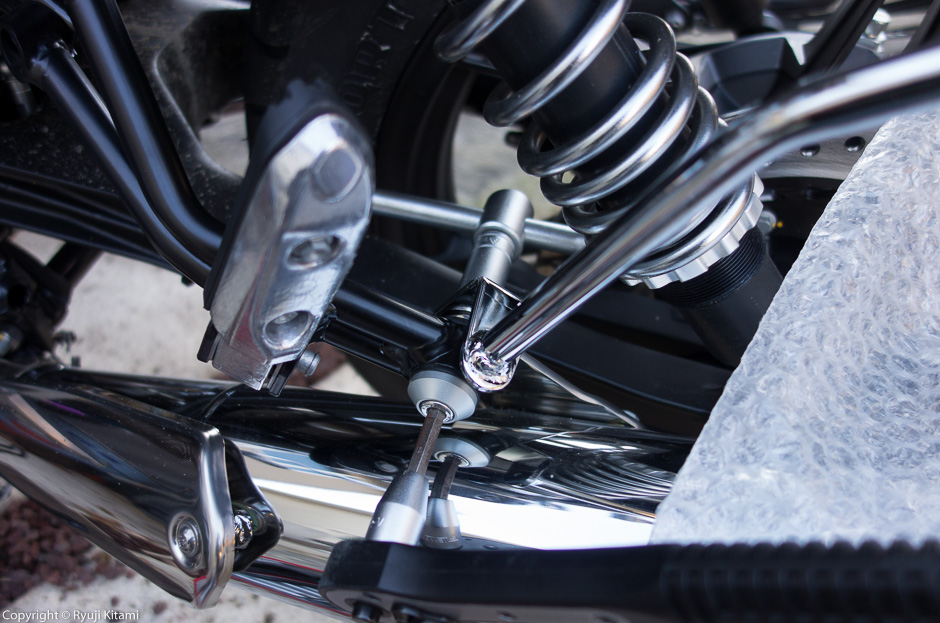新しいボルトを使って、サイドバッグステーを仮留めします。