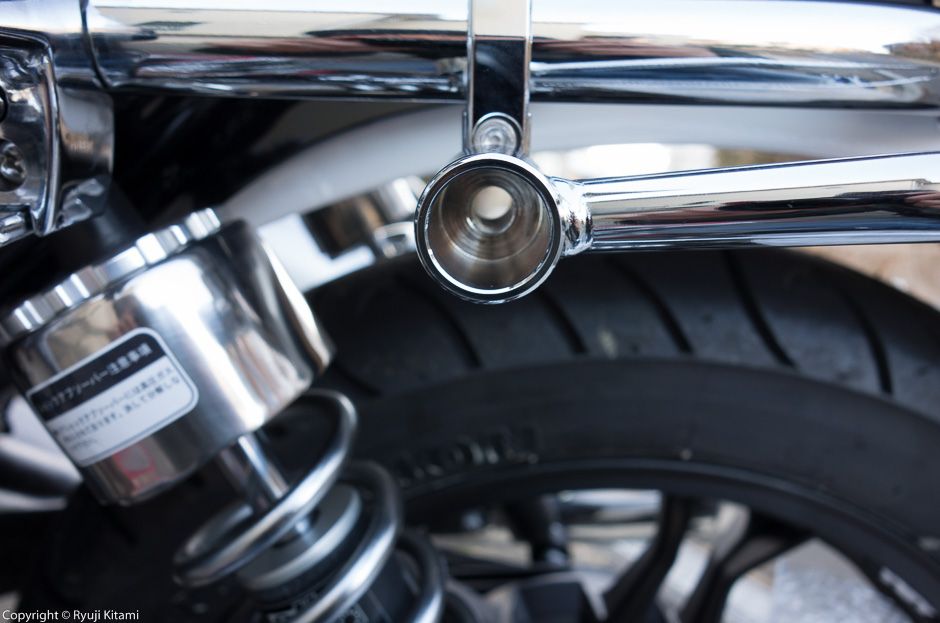 まずマフラーをとめているボルトを外し、この元の長さにサイドバッグステーの厚み分が足されても大丈夫な長さのボルトを、新しくホームセンターで買ってきました。元と同じくステンレス製。