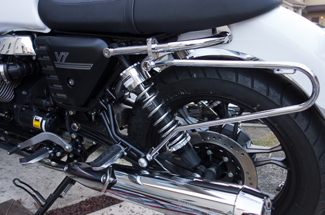 ただ、マイナー車種の悲しいところで、取り付けにあう適当なサドルバッグサポートはありません。なのでサイドミラー移設用のステーホルダーと、ボンネビル用のサイドバッグステー