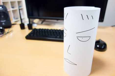 まずは色の変化を確認するためとして、コピー用紙にちょちょいと顔を描いてくるりと丸めてご登場いただきます。
