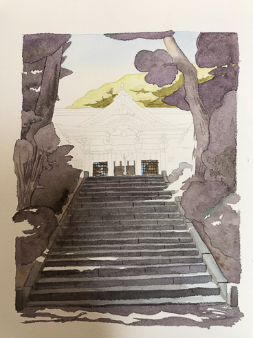 そもそも、この景色の何を描きたかったんだっけか...と写真とにらめっこして考えてみれば、「神社そのもの」じゃなくて、「そこへと至る道」も含めたコントラストが描きたかったんですよね。うっそうと茂る樹のトンネル。その中を抜ける階段。その向こう側に光に囲まれた神社があって...そっちは光に満ちあふれてる...ってなストーリーを描きたいんじゃないかオレは!と。ぜんぜんそんなこと意識してなかったけど、写真をじっと見てるうちにそんな気がしてきたから多分きっとそう。